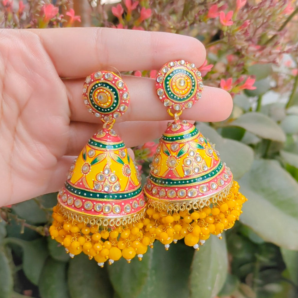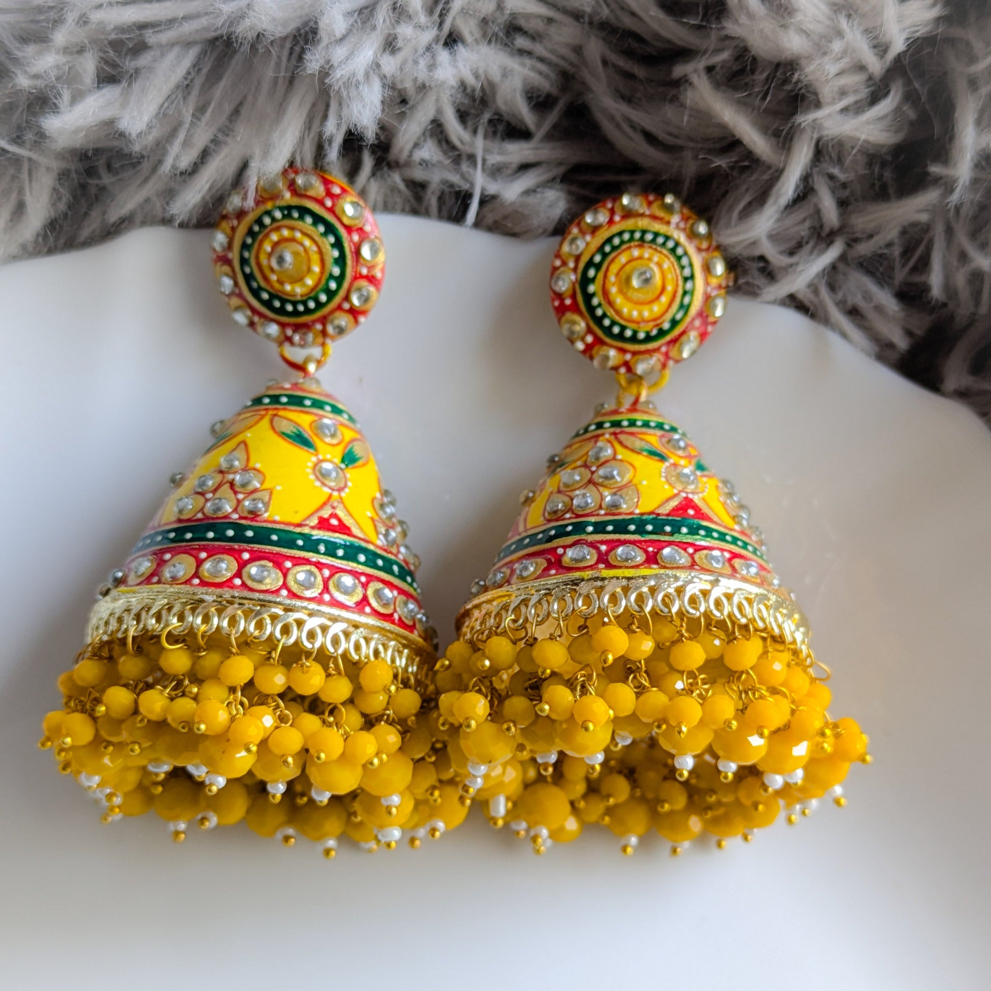 Yellow Tanjore Art Handpainted Jhumka Earring